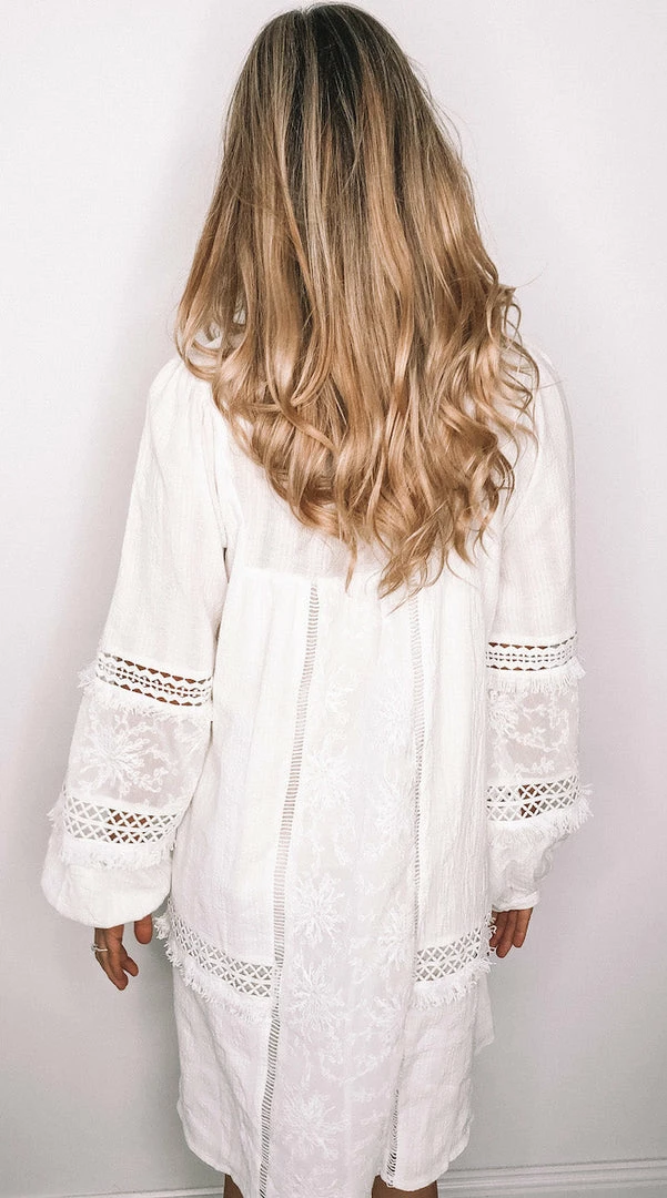 Our Sandbar Dress comes in a vintage white. It’s a gorgeous lightweight material with lining making this a functional addition to the wardrobe perfect for transitioning you to Spring. The floral textured material, tassel and lace detailing are gorgeous bohemian features. The mini length and relaxed fit will make this your next go-to spring dress.