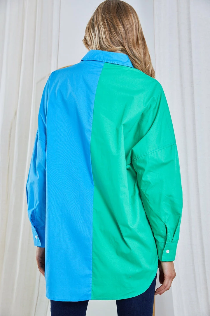 Our Agila Top comes in fun blue and green color. It features a classic collar, pocket on the chest, long sleeves, a v neckline, and buttons down the front to close. This relaxed top pairs beautifully with basic pants for a fun, casual look!