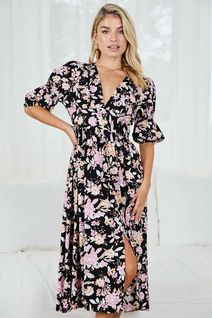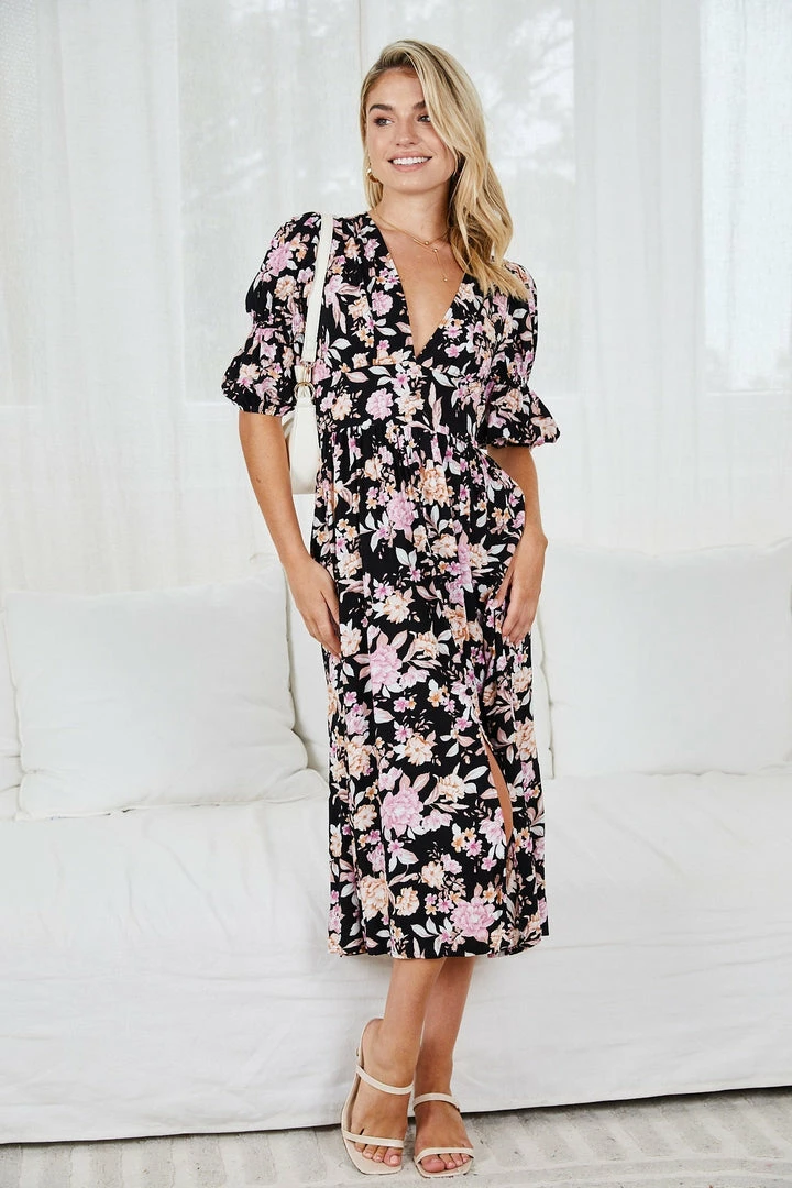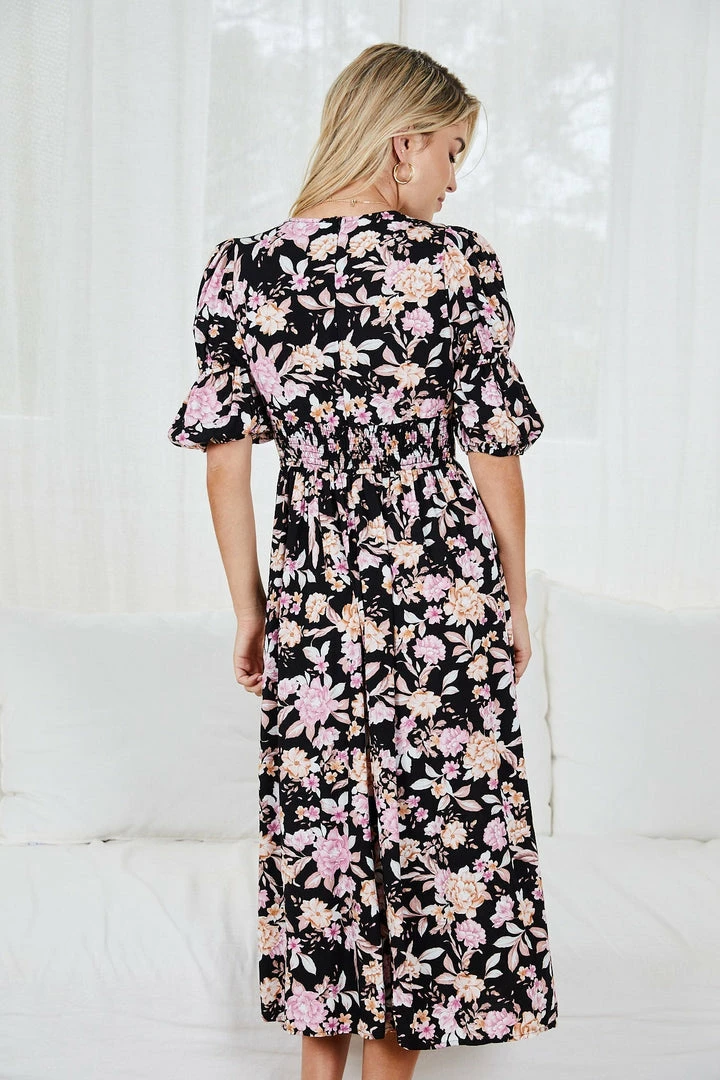 Our Aviona Dress comes in a black tone base, with a pink & orange tone floral print. It features a low v-neckline with buttons on the front of the dress that adds drama! This comfortable and practical piece is perfect for running errands or catching up with friends!