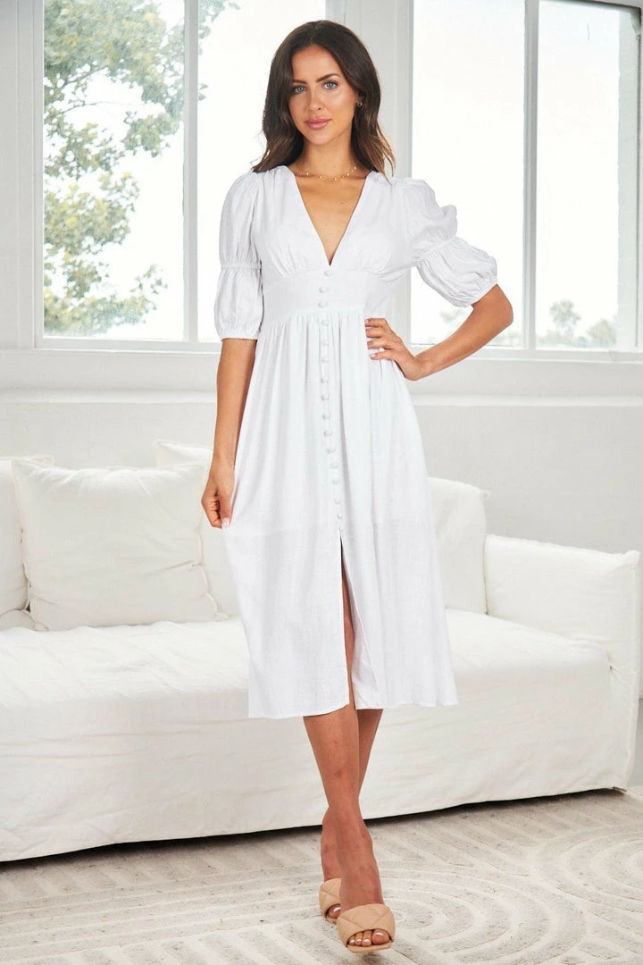 - Key Features: Midi Length. Lightweight material. V neckline. Short sleeves. Flowy skirt. Buttons on the front.