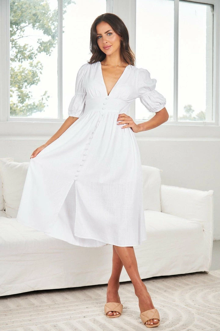 Our Aviona Dress comes in a beautiful white tone. It features a low v-neckline with buttons on the front of the dress that adds drama! This comfortable and practical piece is perfect for running errands or catching up with friends!