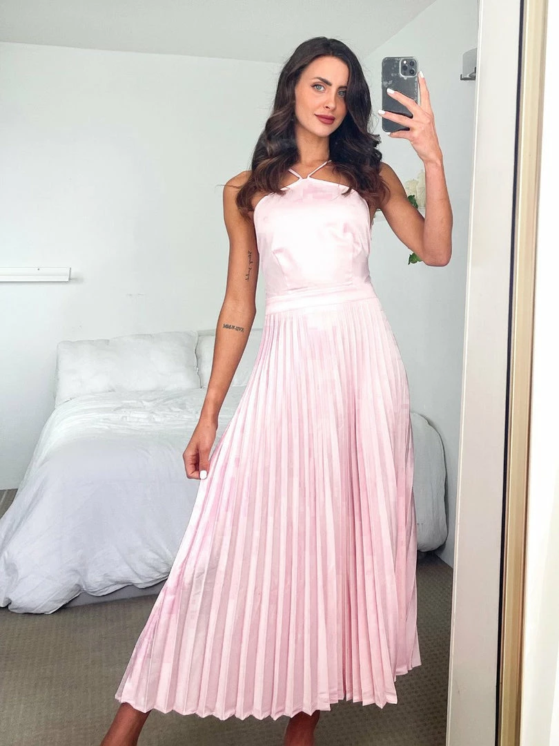 Our Desdemona Dress comes in a soft pink tone. It’s a sleeveless midi that’s perfect for warm spring and summer occasions, and pairs beautifully with heels for a stunning formal look!