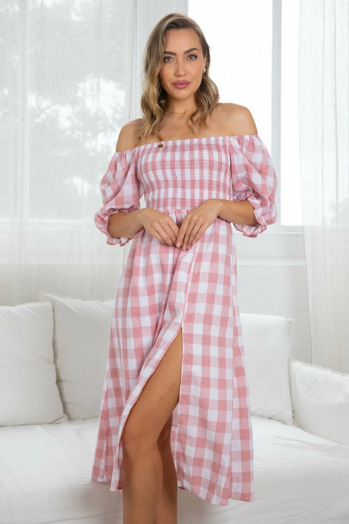 Our Lettice Dress comes in a pink & white tone gingham print. This flowy midi features a square neckline & short sleeves for a relaxed, comfortable fit. It’s a wonderful addition to your wardrobe for the warm spring and summer months!
