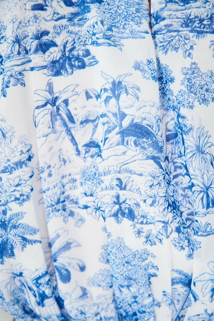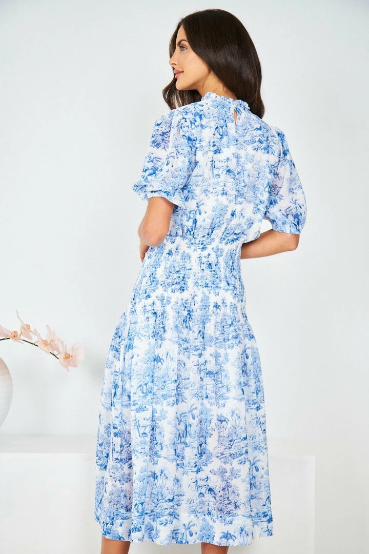 Our Miraflor Dress comes in a white base with blue floral prints. It features a high round neckline, elastic waistband, short bishop sleeves, and frill detailing on the hem and neckline. This flowy midi pairs beautifully with boots or heels for an effortless trans seasonal look!