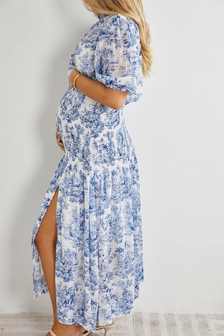 - Key Features: Midi Length. Lightweight material. High round neckline. Short sleeves. Frill detailing on the hem and neckline. Flowy skirt. Elastic waistband. Maternity friendly.