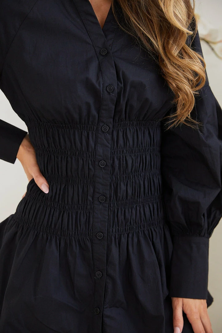Our Seraphina Tunic comes in an ink black colour. Be the crowd favourite in this beautiful staple that features long balloon sleeves with macro cuffs, smocking on the waist and centre-front buttons. Wear it with shorts to show off your beautiful legs or pair with jeans for a modest look!