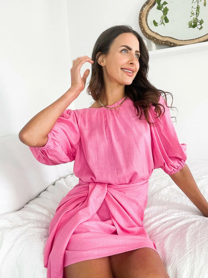 Our Essa Dress comes in a bright pink tone. It features a high neckline and short sleeves for a relaxed, comfortable fit. This flowy midi pairs beautifully with heels for a stunning look this spring season!