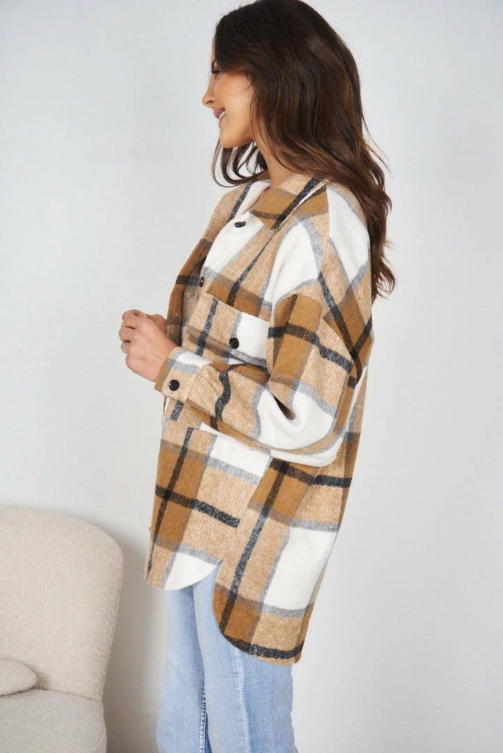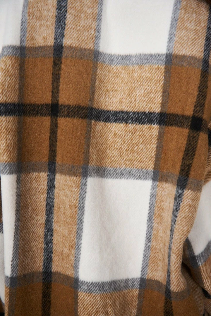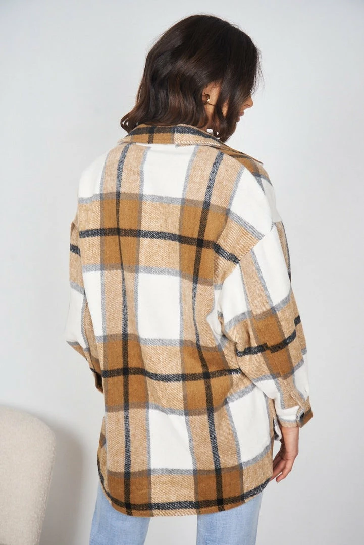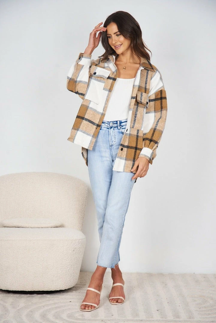 Our Marci Shirt comes in a light brown, black and white tone print. It features a traditional collar, long relaxed sleeves, pockets on the chest, and buttons down the front to close. This warm shacket pairs beautifully with basic pants for a warm, casual look!