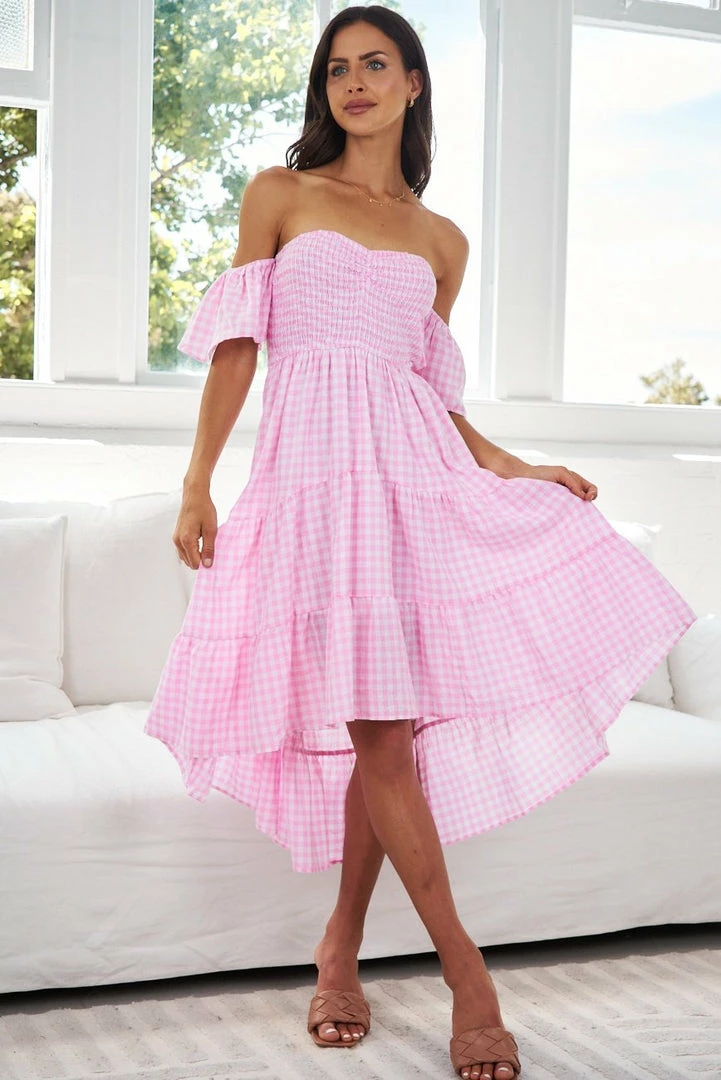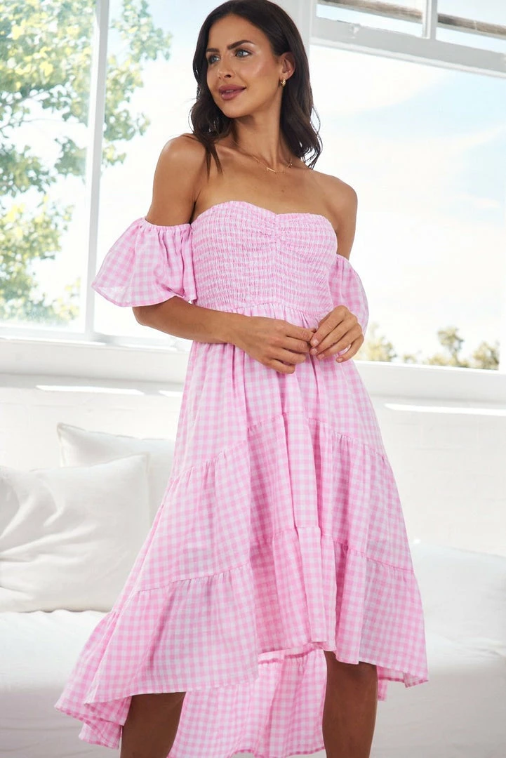 Our Marcie Dress comes in a light pink & white tone gingham print. It features a square neckline and short sleeves for a relaxed, comfortable fit. This midi pairs beautifully with heels for a cute spring look!