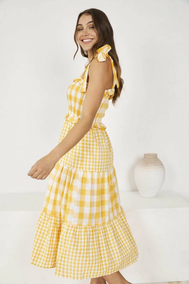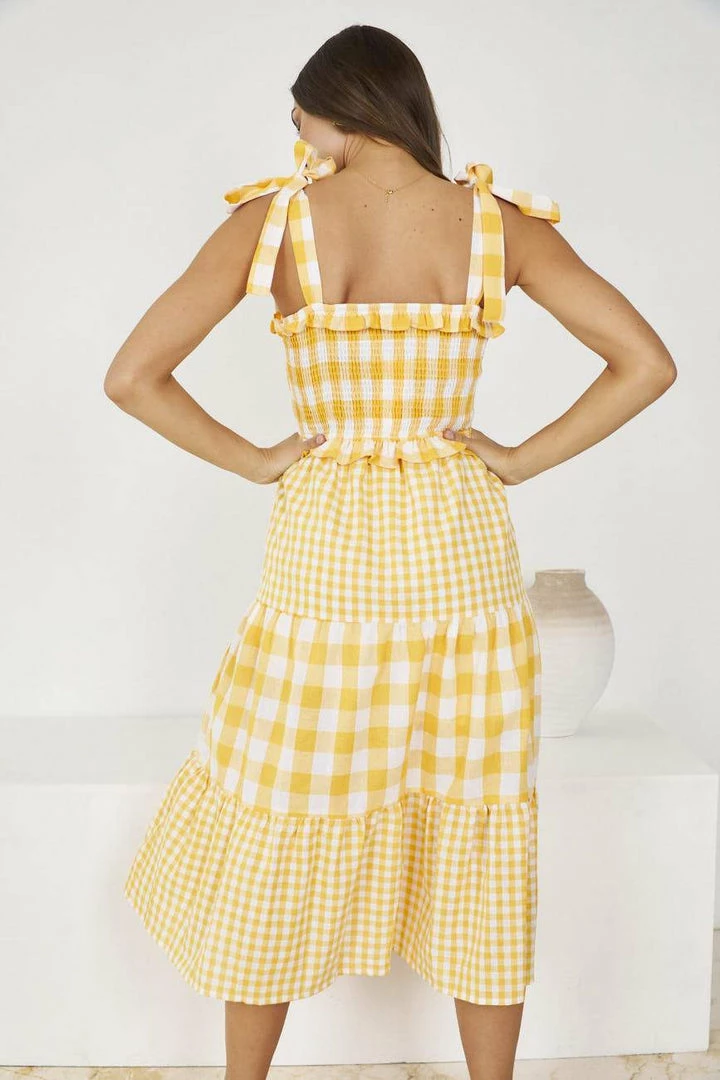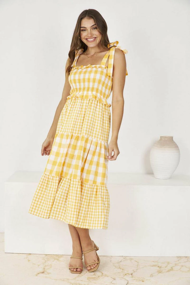 Our Margaret Dress comes in an orange & white check print. It features a square neckline and adjustable straps for a relaxed, comfortable fit. This flowy midi is a cute addition to your spring wardrobe!