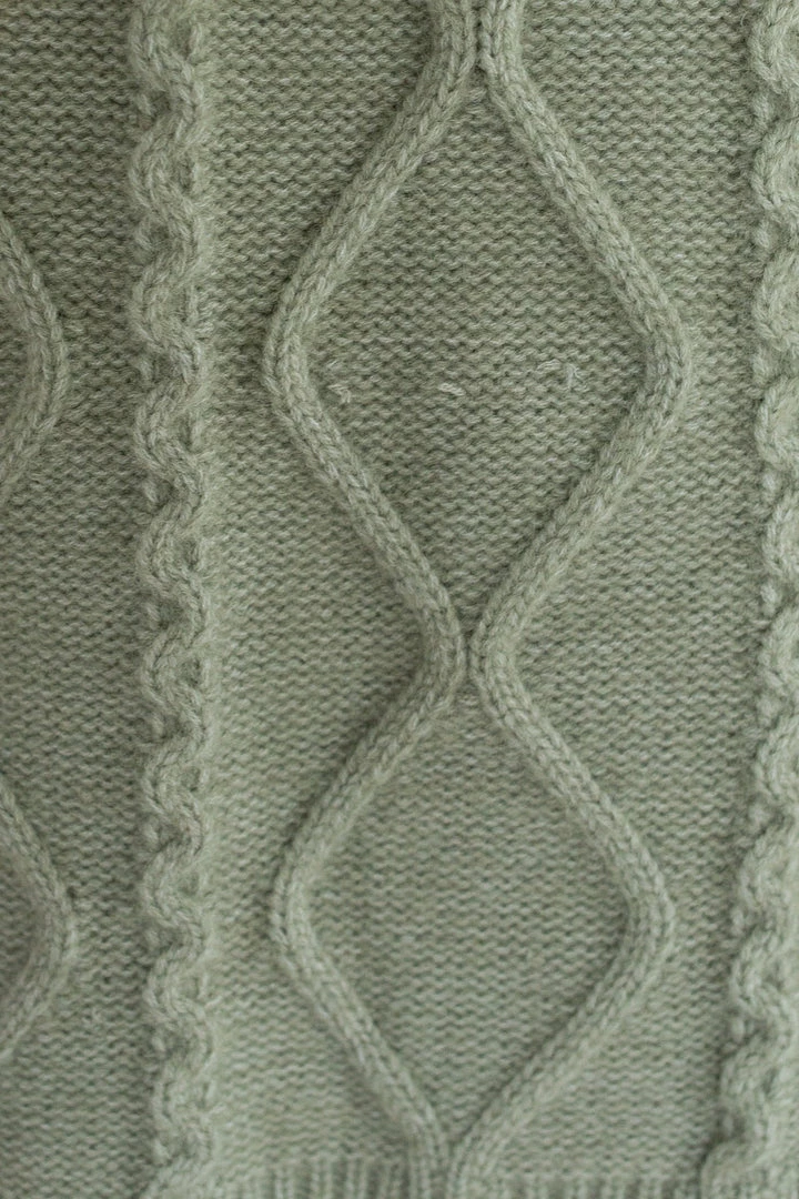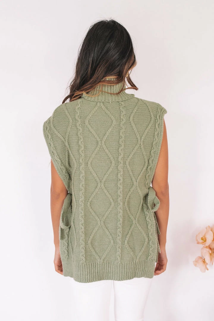 Our Sylvie Knit is a subtle sage tone. This sleeveless knit features a high turtleneck, a woven knit pattern around the garment, as well as knot detailing on the side. Pair with your favourite pair of chinos for an effortless trans-seasonal look!