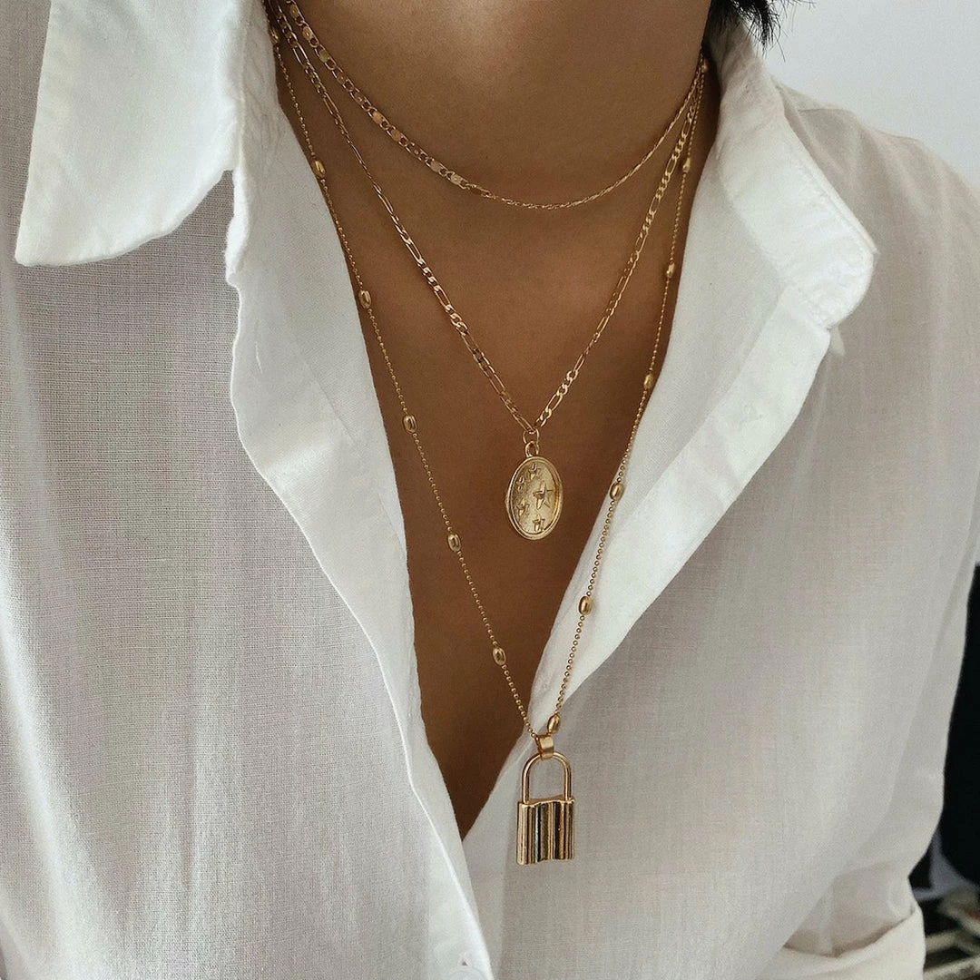 - Key Features: Gold tone. Triple-layered necklace. Astrology inspired pendant. Lock pendant.